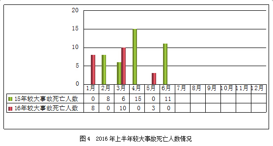 2016年上半年,全国共发生房屋市政工程生产安全较大事故6起、死亡21人,比去年同期事故起数减少4起、死亡人数减少19人(见图3、图4),同比分别下降40.00%和47.50%;未发生重大及以上事故。